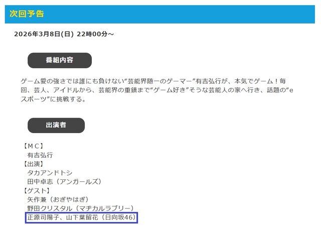 次回の「有吉ぃぃeeee!」に日向坂46メンバー2名が出演! 2026年03月03日 カテゴリ:正源司陽子山下葉留花 mixiチェック 次回の「有吉ぃぃeeee!」に日向坂46メンバー2名が出演します!<div id="bnc_ad_19158"></div><textarea class="script_source">__lt__script async src="https://js.ssp.bance.jp/bnctag.js"__gt____lt__/script__gt__ <関連する記事> <関連する画像> <関連する動画> <ツイッターの反応> タグ :#日向坂46#有吉ぃぃeeee#正源司陽子#山下葉留花 こちらもおすすめ! このページは「超・乃木坂まとめ誕生!」が管理しています。 「正源司陽子」カテゴリの最新記事 コメントする コメントフォーム 名前 コメント 記事の評価 リセット リセット 顔 星 情報を記憶 コメントを投稿する  アニメ「リラックマ」のイベントに櫻坂46メンバー6名が登壇!金村美玖がブログでミニスカ美脚を披露!【おすし】【日向坂46】